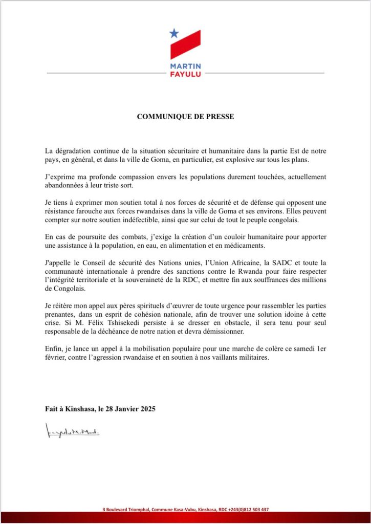L’opposant Martin FAYULU, a, dans un communiqué rendu public ce mardi 28 janvier 2025 , appelé à une manifestation populaire , « je lance un appel à la mobilisation populaire pour une marche de colère ce samedi 1er février contre l’agression rwandaise et en soutien à nos vaillants militaires ».
